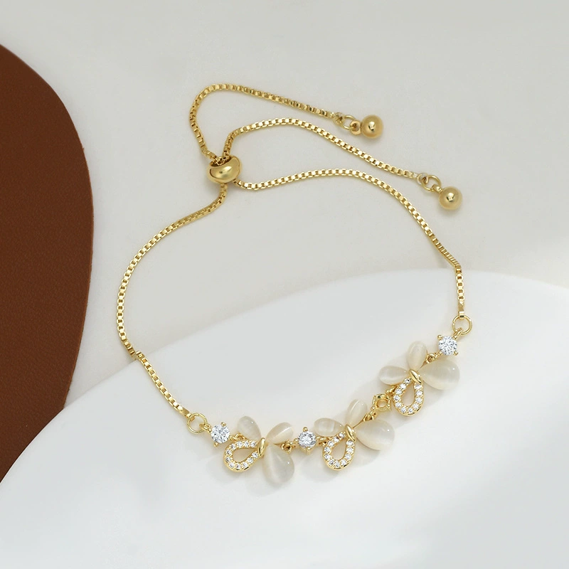 Cat Eye Stone Flower Adjustable Pull Chain Bracelet