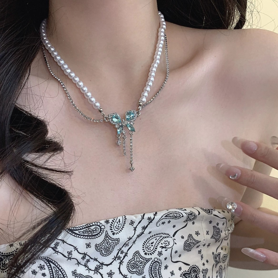 Blue Butterfly Crystals Vintage Double-Layer Tassel Choker Necklace