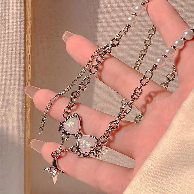 Sweet Vintage-Inspired Bow & Star Pearl Pendant Necklace