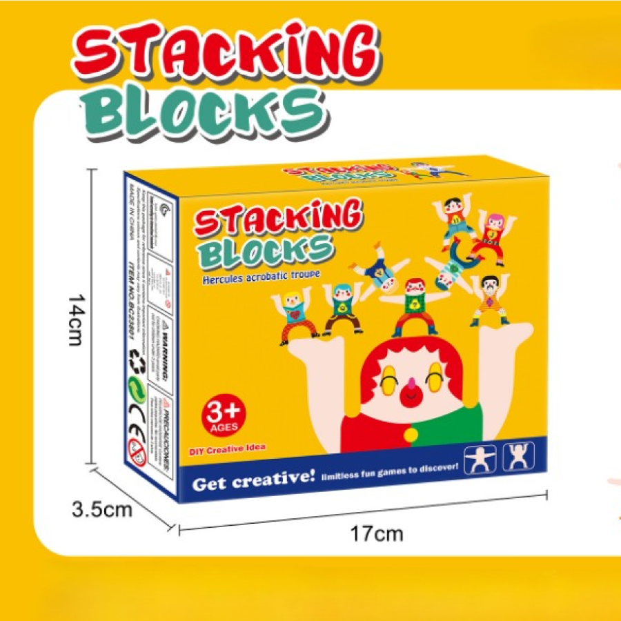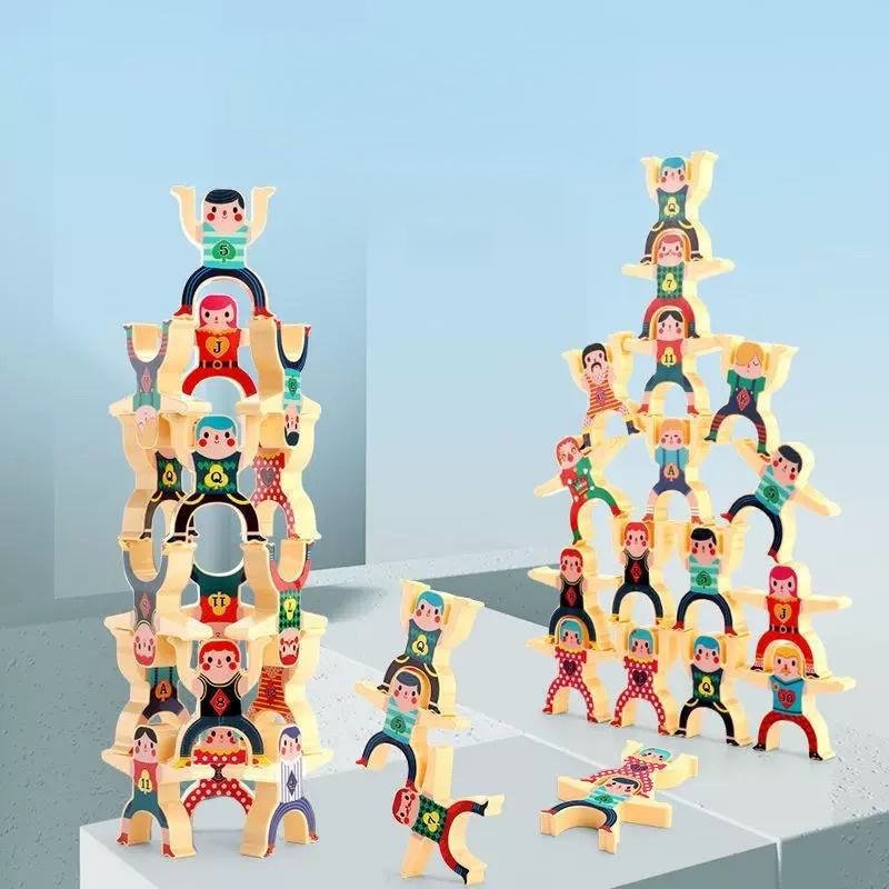 Fun balance stacking game with colorful blocks shaped like strongmen. Kids can stack and balance to build higher towers while developing patience, coordination, and logical thinking.