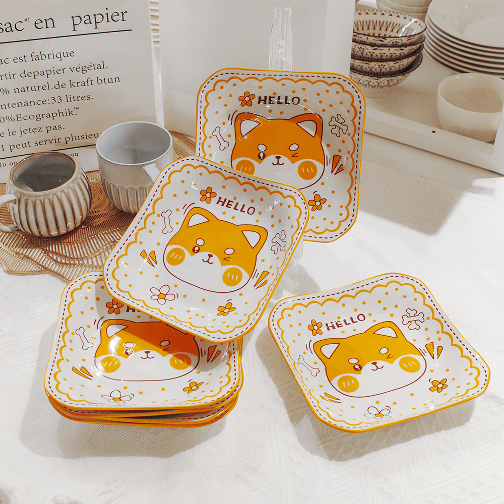 7-Inch Cute Shiba Inu Square Plate Orange Cartoon Dog Ceramic Dish