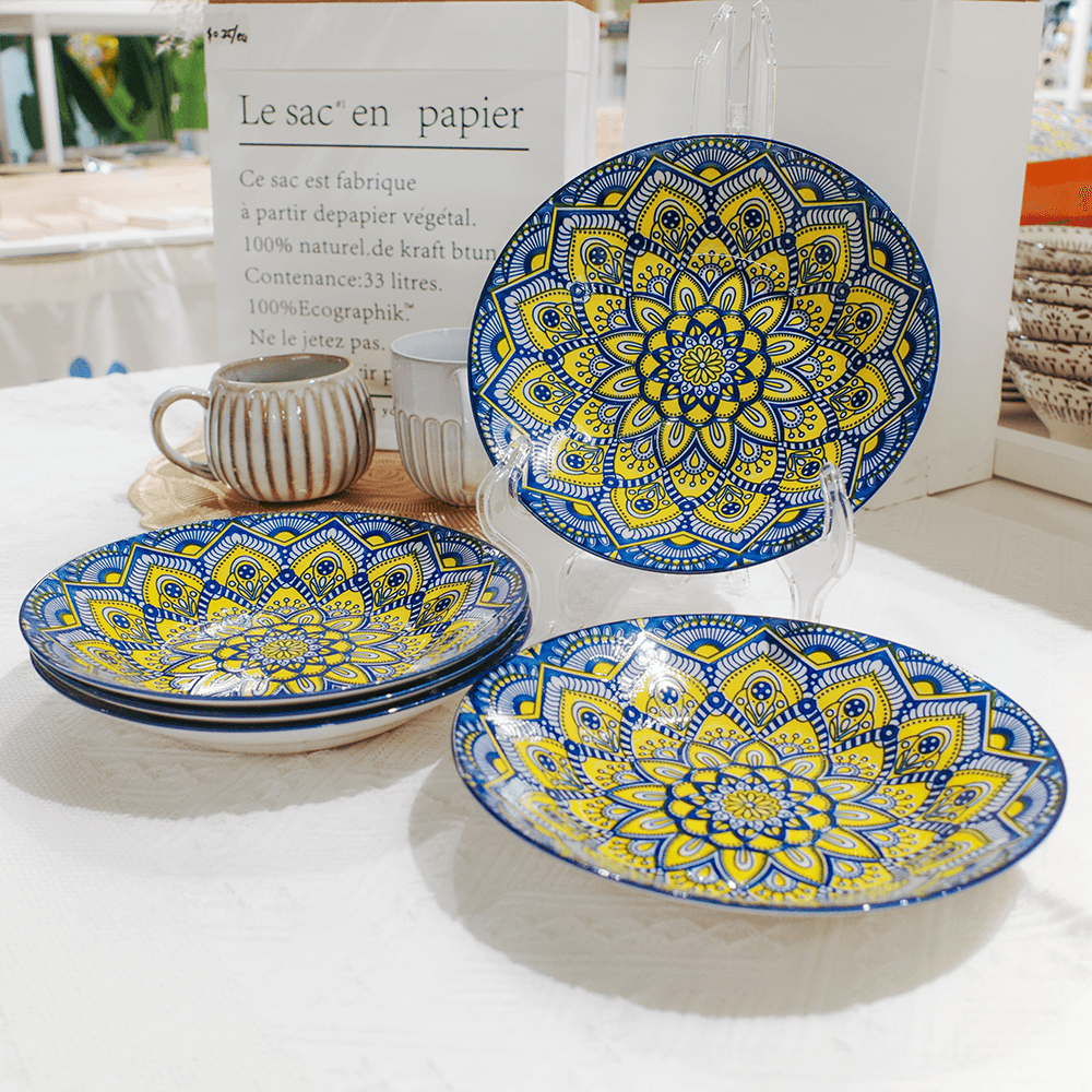 Bohemian Mandala 8-Inch Deep Plate Blue & Yellow Ceramic Soup Bowl